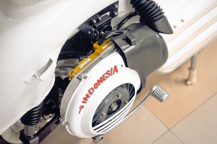 Uniknya masih dipasang rengkes sebelah kanan, lengkap dengan kipas dan kickstart Vespa klasik.