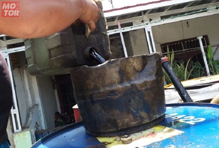 Beberapa bengkel motor biasanya suka mengumpulkan sisa oli bekas saat motor milik konsumen ganti oli di sebuah wadah atau drum besar.