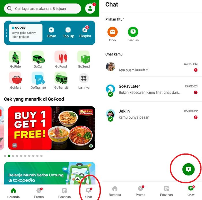 Caranya cukup mudah, buka aplikasi Gojek dan pilih kanal chat di bagian kanan bawah.