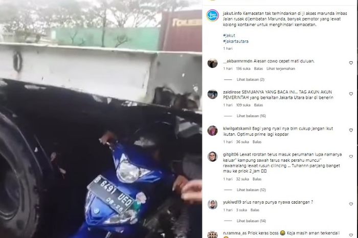Seperti postingan dari @jakut.info dimana para pemotor banyak yang nekat melewati kolong kontainer untuk menghindari kemacetan di Jl. Akses Marunda.