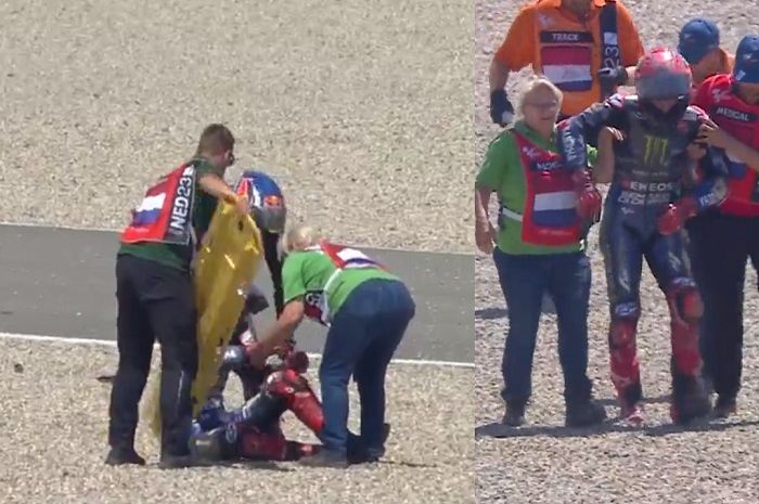 Setelah bangun, Fabio Quartararo jalan pincang sambil dibantu marshall.