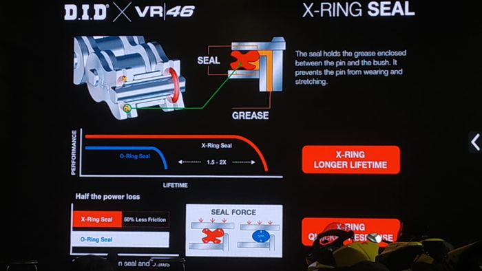 "X-Ring ini adalah teknologi buatan DID yang sudah dipatenkan. Dengan teknologi yang menahan pelumas ini usia pakai rantai menjadi lebih panjang," ujar Ardhieta Wicaksana, Marketing Manager PT NGK Busi Indonesia.