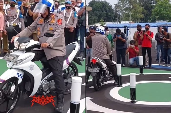 Momen Kapolsek turun kaki saat ujian praktek SIM C angka 8 pakai motor Yamaha Jupiter Z1 bertema polisi beredar luas di media sosial.