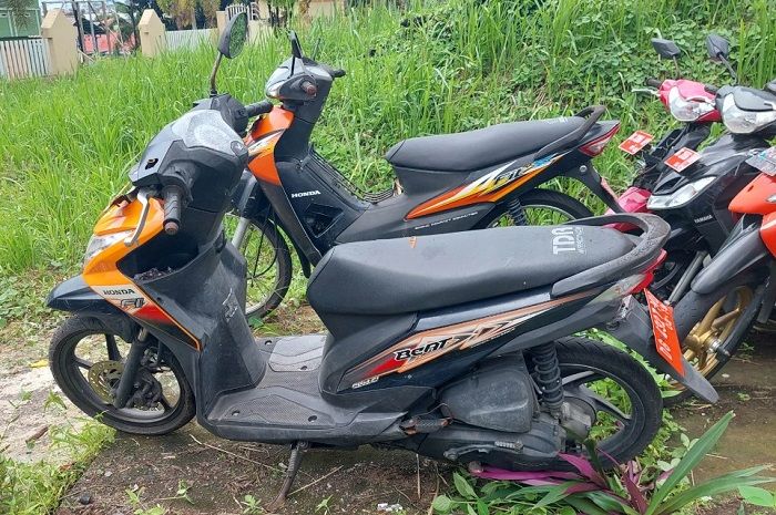 Dengan cara penawaran open bidding, Honda BeAT berwarna oranye-hitam itu ada STNK dan BPKB-nya.