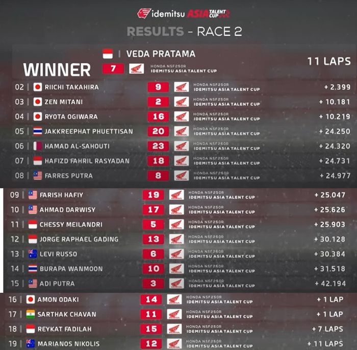 Veda pun menyelesaikan Race 2 ATC Malaysia 2023 sebagai pemenang dengan selisih 2,3 detik dari Riichi.