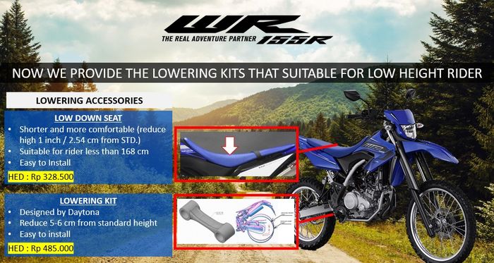 Untuk low down seat Yamaha WR 155 R dibanderol Rp 328.500, sementara lowering kit dijual Rp 485.000.