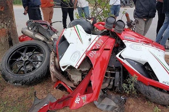 Ducati dengan tipe Ducati 848 tersebut terlihat fairing depannya terbelah dua akibat benturan yang cukup keras.