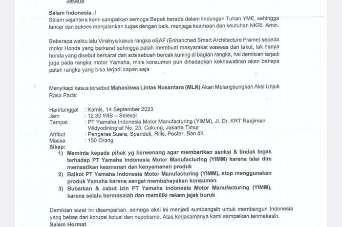 Surat atau selebaran izin demo rangka eSAF tersebut ditujukan kepada Kapolres Jakarta Timur.