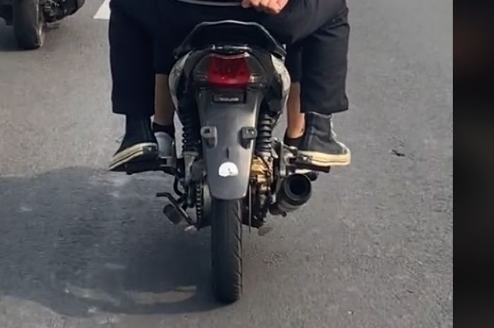 Ternyata sang pembonceng, memegang pelat nomor agar tetap bisa dilihat pengendara belakangnya.