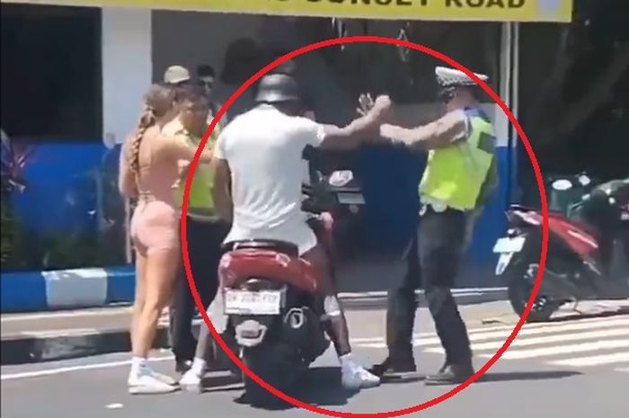 Tidak terima mendapatkan teguran, pria WNA yang mengendarai Yamaha NMAX itu pun mendorong Polantas.