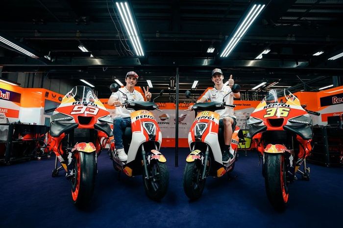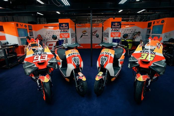Semua sponsor dari Repsol Honda Team pun ikut terpampang untuk motor wara-wiri yang digunakan Marc Marquez dan Joan Mir ini.