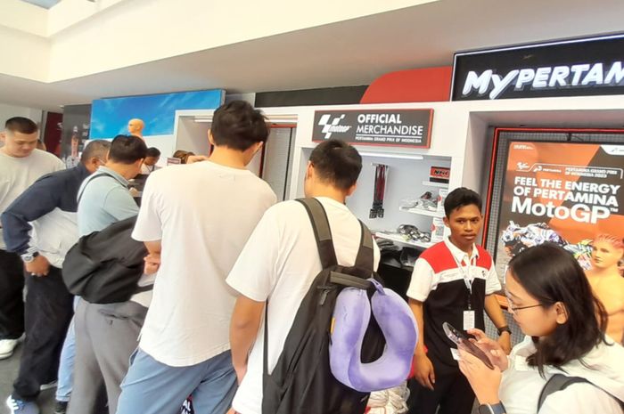 Paling ramai diserbu pendatang, tentu saja booth merchandise resmi MotoGP Mandalika 2023.