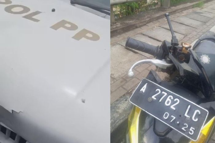 Terlihat foto mobil Satpol PP penyok di bagian kap mesin.