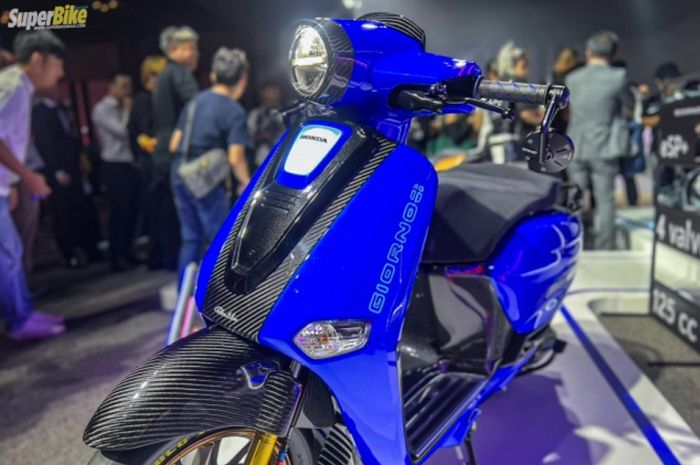 Tak hanya body karbon, warna biru cobalt melapisi sebagian besar body halus di Honda Giorno+ ini.