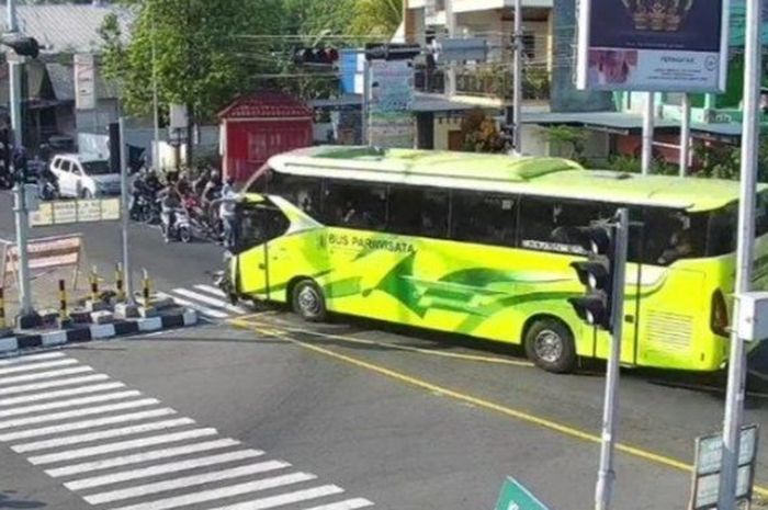 MOTOR Plus-online.com - Pemotor terlindas bus pariwisata yang nekat menerobos lampu merah, kondisi korban bikin kaget.