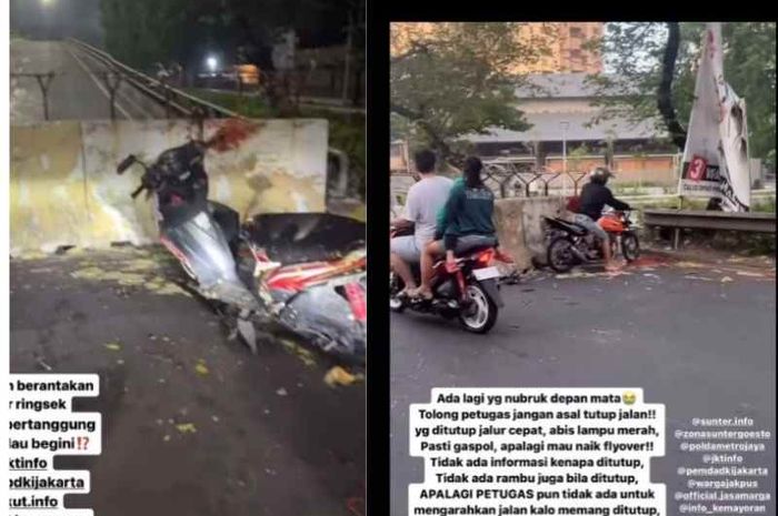 Tidak ada rambu penutupan jalan dan tidak ada petugas yang berjaga, sejumlah pengendara motor mengalami kecelakaan menabrak beton di Fly Over Dari sunter menuju Kemayoran pada Minggu Pagi (31/12).