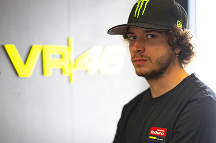 Tatapan tajam Marco Bezzecchi tidak bikin salah fokus alias salfok dengan penampakan logo baru skuat MotoGP milik Valentino Rossi musim ini.