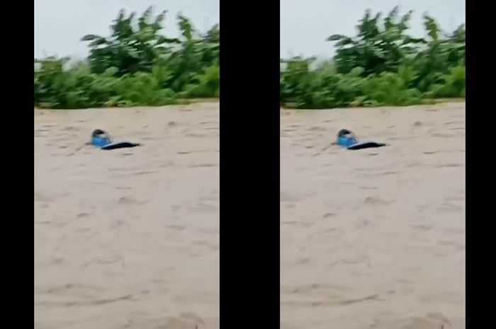 Sebuah motor Yamaha NMAX berwarna biru hanyut terbawa derasnya banjir imbas Sungai Cilalanang yang meluap.
