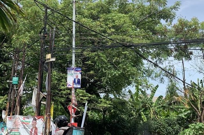 Lehernya telilit kabel yang menjuntai di Jalan Raya Chandrabaga, Kelurahan Kaliabang Tengah, Kecamatan Bekasi Utara, Kota Bekasi, Senin (22/1/2024).