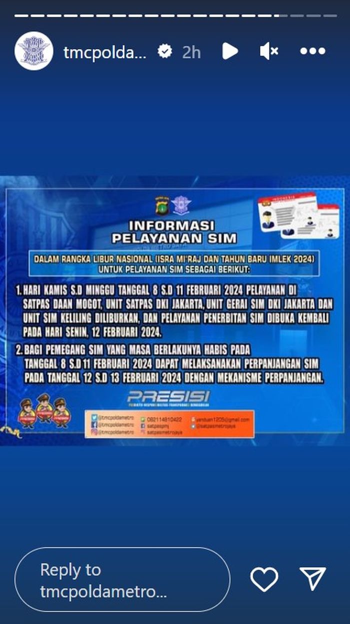 "Bagi pemegang SIM yang masa berlakunya habis pada tanggal 8 s.d. 11 Februari 2024 dapat melaksanakan perpanjangan SIM pada tanggal 12 s.d. 13 Februari 2024 dengan mekanisme perpanjangan," tulis akun Instagram TMC Polda Metro Jaya.
