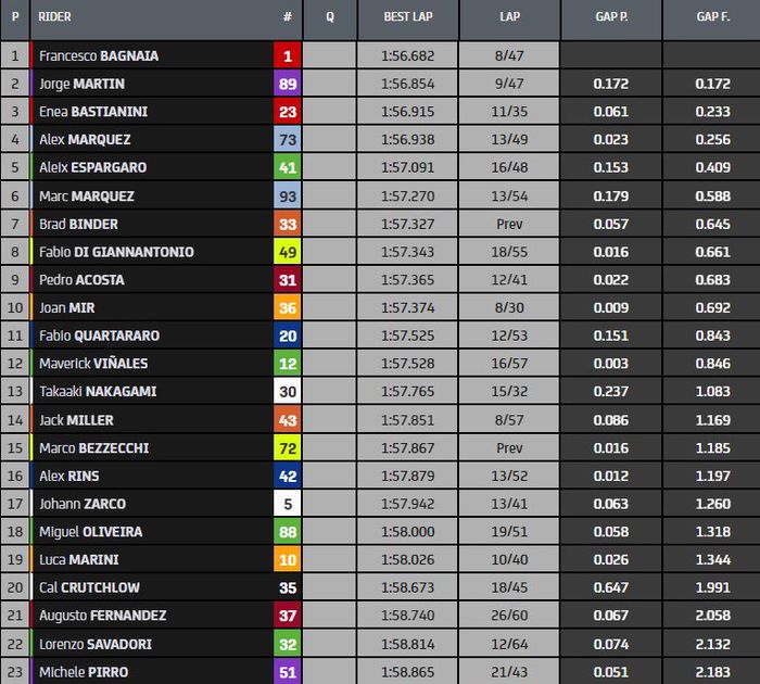 Lalu KTM bersama tim Gasgas menempatkan Pedro Acosta di posisi kedelapan dengan jarak 0,683 dari Pecco.