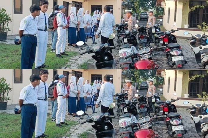 Petugas Satlantas Polsek Wonoayu memberhentikan beberapa pelajar di Kawasan Wonoayu, Sidoarjo, Jawa Timur pada Kamis (7/3/2024).