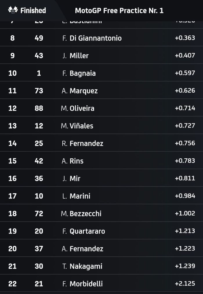 Posisi kedua dan ketiga masing-masing diraih Aleix Espargaro (Aprilia Racing) dan Pedro Acosta (Red Bul GASGAS Tech3).