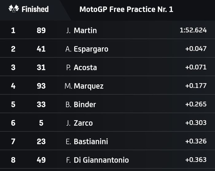 Saat FP1 MotoGP Qatar 2024 berakhir, Jorge Martin berhasil mengamankan posisi tercepat.