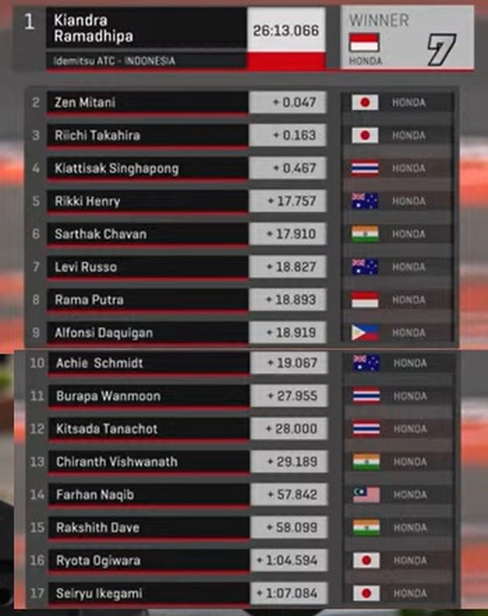 Kemenangan menjadi milik Rama, ini podium pertamanya di kancah balap Asia, juga kemenangan pertama bagi pembalap Indonesia di ATC 2024.