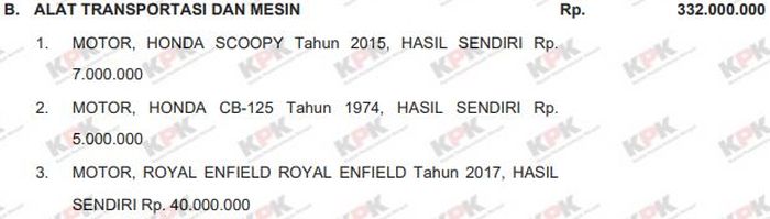 Untuk bagian Alat Transportasi dan Mesin sendiri punya nilai Rp 332.000.000 yang terdiri motor dan mobil.