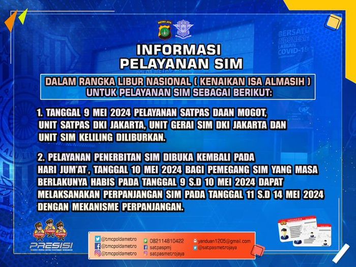 Hal tersebut lantaran Unit Gerai SIM DKI Jakarta dan Unit SIM Keliling diliburkan pada Kamis (9/5/2024).