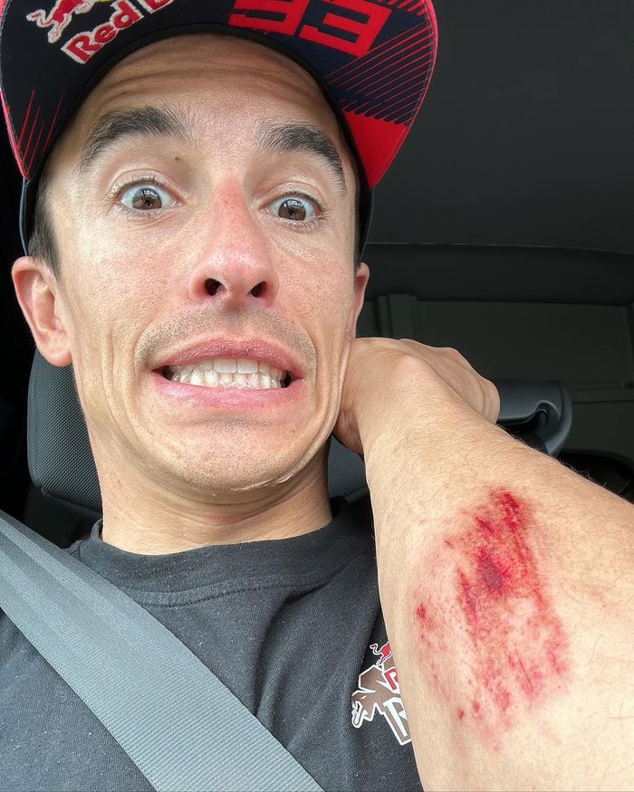 Pada salah satu foto yang dipostingnya, kakak sekaligus pembalap satu tim Alex Marquez itu menunjukkan kondisi tangannya yang lecet.