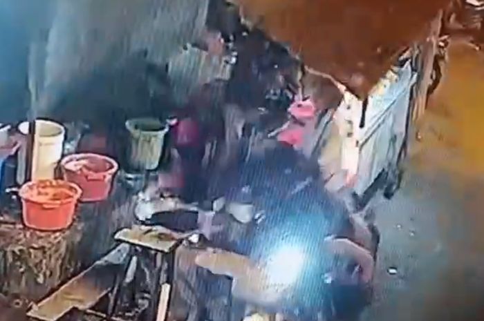 Tidak lama kemudian motor tiba-tiba maju menghajar penggorengan yang berisi minyak panas.
