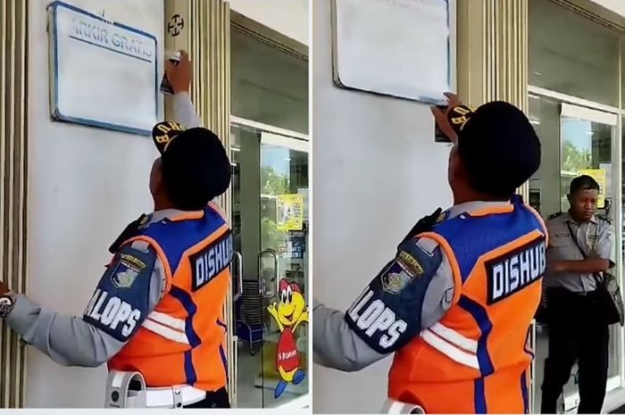 Soalnya oknum berseragam lengkap ini, menghapus plang Parkir Gratis di salah satu minimarket.