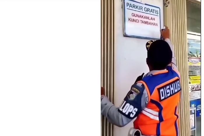 MOTOR Plus - online.com Ramai di media sosial video petugas Dinas Perhubungan (Dishub) menghapus tulisan parkir gratis di minimarket.