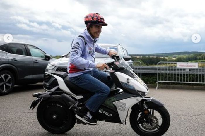 Disela-sela sebelum balap MotoGP, Marc Marquez terciduk tengah mengendarai motor listrik.