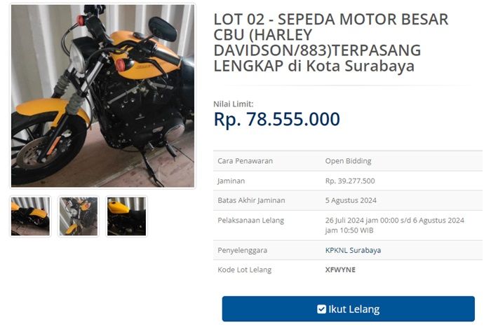 Kalau mau lihat unit Harley-Davidson Iron 883 yang dilelang, bisa mendatangi TPP PT. Indra Jaya Swastika Jl. Kalianak Barat No. 57-A Surabaya pada Kamis, 1 Agustus 2024 jam 09.00-15.00 WIB.