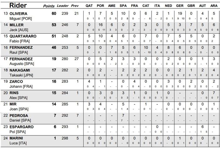 Lebih jelasnya, simak klasemen MotoGP 2024 usai seri Aragon di bawah ini: