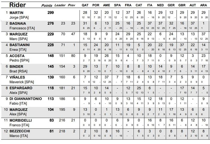 Dengan begitu, rider Italia tersebut memiliiki 276 poin, selisih 23 poin dengan Jorge Martin (Prima Pramac Racing) dengan 299 poin.