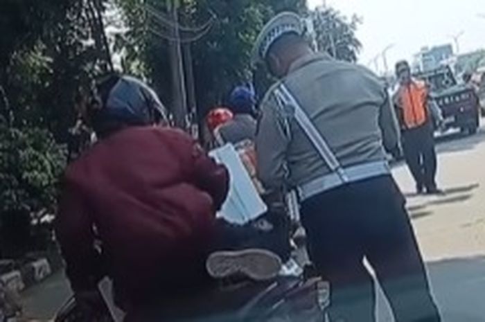 Namun, pemotor tetap berupaya memberi uang secara diam-diam. Anggota Polantas melihat sekelilingnya.