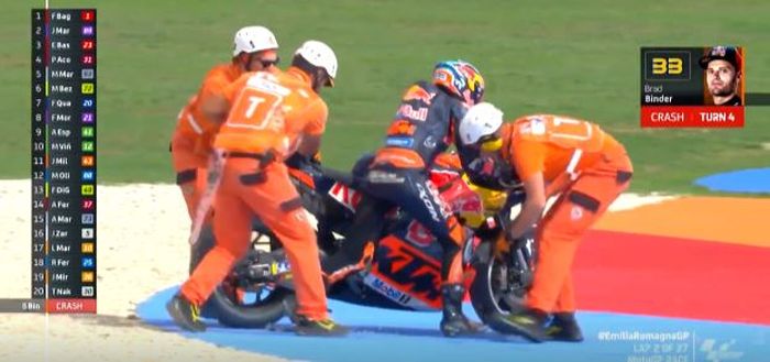 Belum lama balapan berlangsung, Brad Binder (Red Bull KTM Factory Racing) terjatuh di tikungan 4.