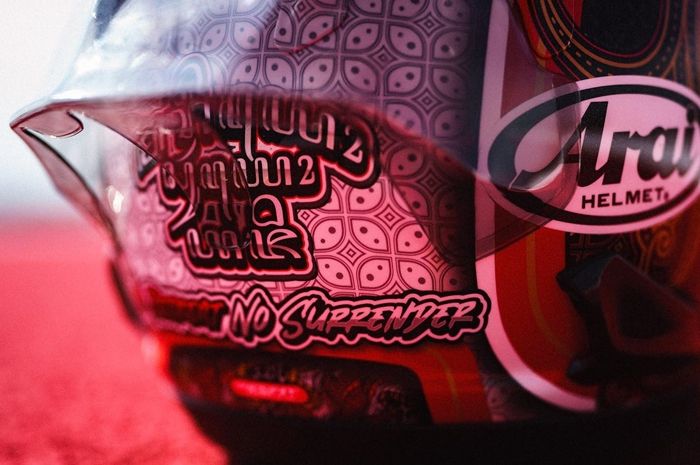 Lalu ada tulisan No Defeat No Surrender, biar Mario Aji semangat pantang menyerah di Mandalika.