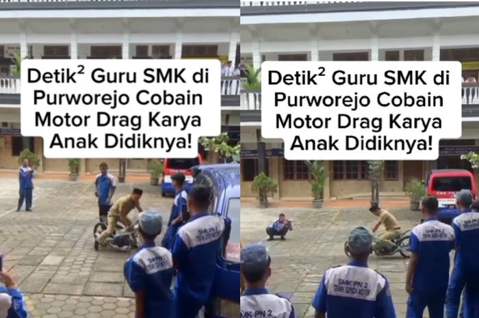 "Detik detik video yang menunjukan seorang guru di sebuah sekolah di Purworejo yang menjajal motor drag modifan dari para muridnya, yaitu SMK PN-PN2 Purworejo," tulis akun tersebut.
