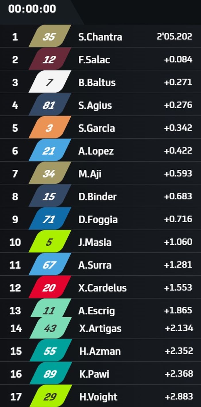 Pembalap satu tim dengan Mario Aji, Somkiat Chantra menjadi yang tercepat di sekitar 3 menit terakhir dengan waktu 2 menit 05,202 detik.
