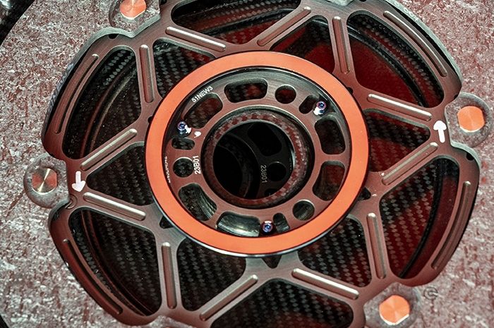 Untuk menjaga posisi cakram karbon MotoGP, rupanya hanya pakai 3 baut saja.