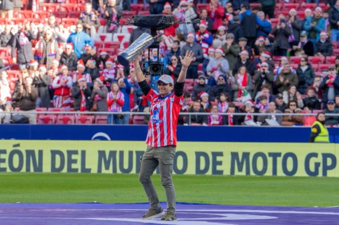 Pembalap asal Spanyol itu disambut seperti pahlawan di stadion tim sepakbola Spanyol, Atletico Madrid.