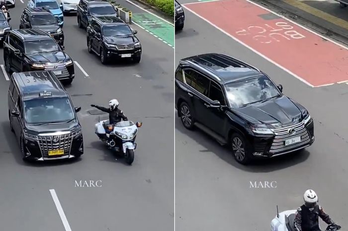 Dalam video yang beredar di media sosial, terlihat seorang rider patwal sedang mengawal Lexus LX 600.