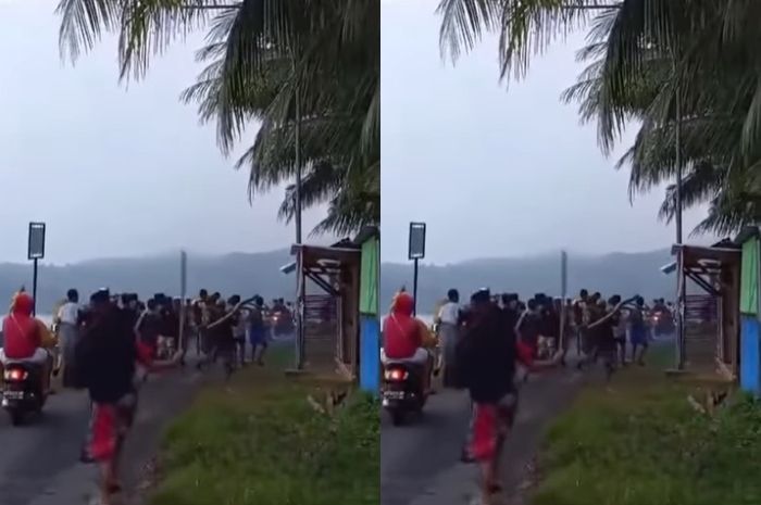 Dalam video, terlihat beberapa warga sekitar yang geram dengan ulah pemotor yang konvoi tersebut, mengusir sambal membawa kayu.