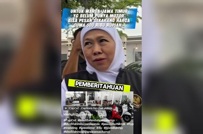 "Assalamualaikum, pemberitahuan untuk seluruh warga Jawa Timur. Saya selaku Gubernur Jawa Timur, siapa saja belum mempunyai motor atau ingin motor baru, silakan memesan motor murah. Harganya hanya Rp 500 ribu. Ini amanah dari saya. Pesan sekarang. Juga tidak bisa COD ya. Pengiriman bisa hari ini, surat-surat lengkap, bisa atas nama sendiri, hanya untuk warga Jawa Timur ya," ujarnya dalam video.