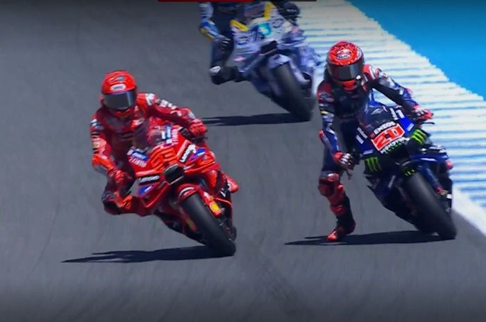 MOTOR Plus-Online.com - Sprint MotoGP Spanyol 2025 yang digelar pada Sabtu (26/4/2025) menjadi momen ketat antara Fabio Quartararo (Monster Energy Yamaha MotoGP) dan Marc Marquez (Ducati Lenovo).